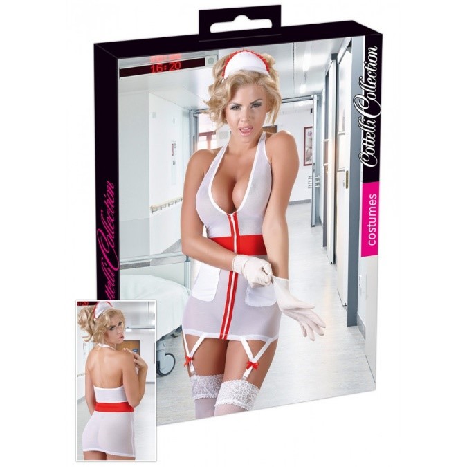 Il Costume Mini Abito da Infermiera Sexy è un irresistibile vestitino che incarna la sensualità e l'autorità dell'infermiera maliziosa. Realizzato con cura nei dettagli, presenta un design bianco arricchito da decorazioni rosse che aggiungono un tocco di passione. La profonda scollatura e l'allacciatura al collo mettono in risalto le forme femminili, mentre i due taschini sulla parte frontale offrono un tocco di autenticità e praticità, perfetti per portare con sé i "giusti attrezzi" del mestiere. Completo di un cappellino abbinato, questo mini abito da infermiera sexy è l'ideale per creare un'atmosfera di seduzione e gioco di ruolo nella tua intimità.
