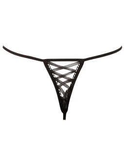 String con ricami floreali (rose) bicolore nella parte anteriore; fiori con ornamenti pietre diamantate, strass - formando un anello ciascuna - sui lati. Apertura anteriore, ornati di frange reno pietre, allacciatura piccolo nella parte posteriore. Nero / rosso. 80% poliammide, 10% poliestere